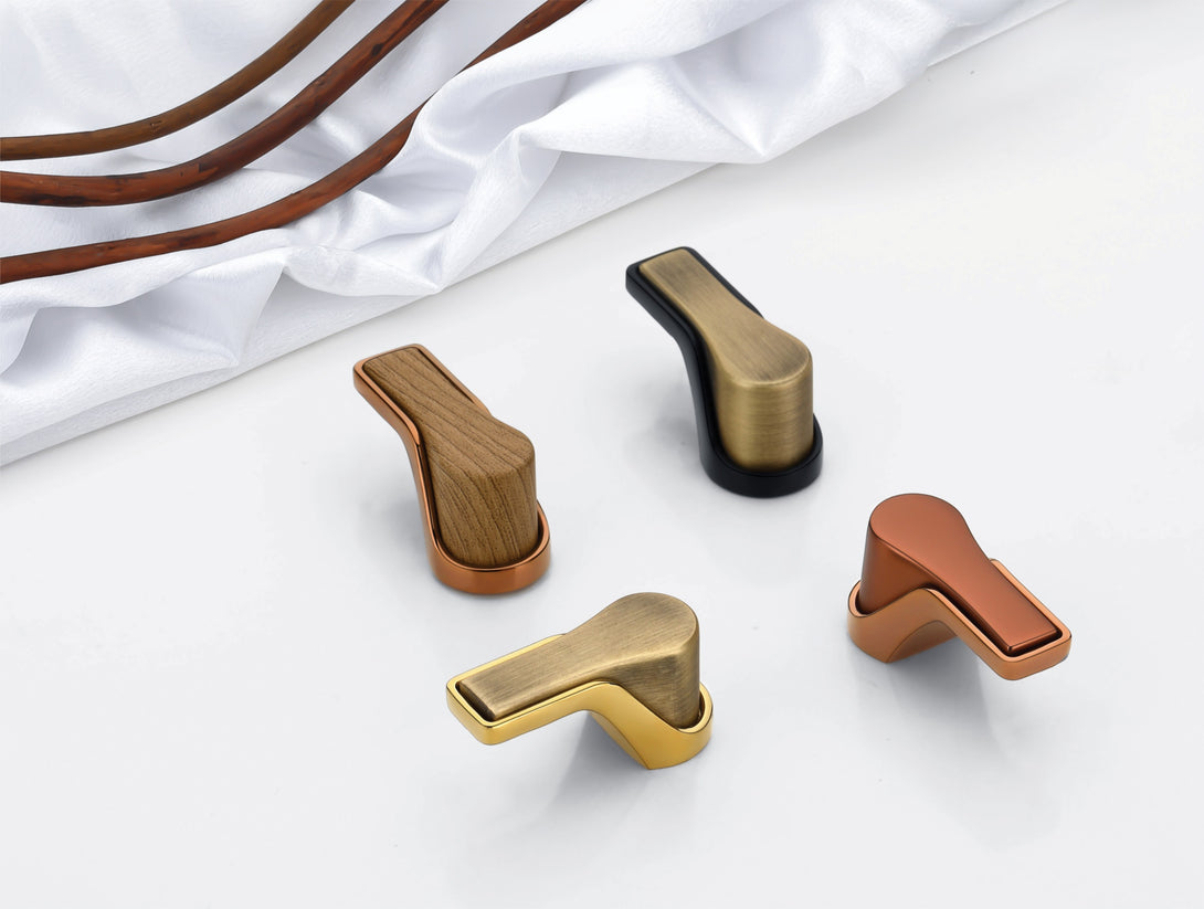 Crafted for durability and a pleasant tactile experience, these unique knobs offer both visual interest and practical functionality. They are available in a range of sophisticated and striking combinations: a luxurious PVD Rose Gold base topped with a natural Wood insert, offering warmth and modern appeal; a full PVD Rose Gold option for consistent metallic elegance; and a bold Z Black (Matte Black) top contrasted with a rich Antique Brass base, creating a sophisticated two-tone effect. The PVD (Physical Vapor Deposition) coating on the metallic elements ensures exceptional durability, scratch resistance, and a vibrant, long-lasting finish. These diverse material and finish options allow you to choose the perfect complement to your existing decor or to create an entirely new focal point.